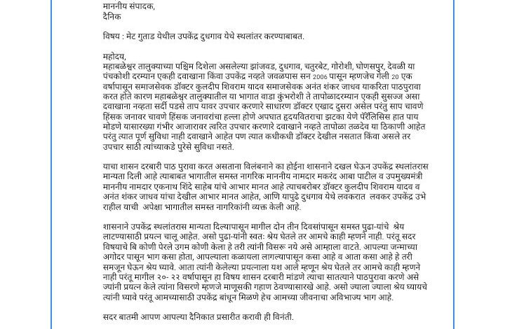 याचा शासन दरबारी पाठ पुरावा करत असताना विलंबनाने का होईना शासनाने दखल घेऊन उपकेंद्र स्थलांतरास मान्यता दिली आहे त्याबाबत भागातील समस्त नागरिक माननीय नामदार मकरंद आबा पाटील व उपमुख्यमंत्री माननीय नामदार एकनाथ शिंदे साहेब यांचे आभार मानत आहे त्याचबरोबर डॉक्टर कुलदीप शिवराम यादव व अनंत शंकर जाधव यांचा देखील आभार मानत आहेत, आणि यापुढे दुधगाव येथे लवकरात लवकर उपकेंद्र उभे राहील याची अपेक्षा भागातील समस्त नागरिकांनी व्यक्त केली आहे.