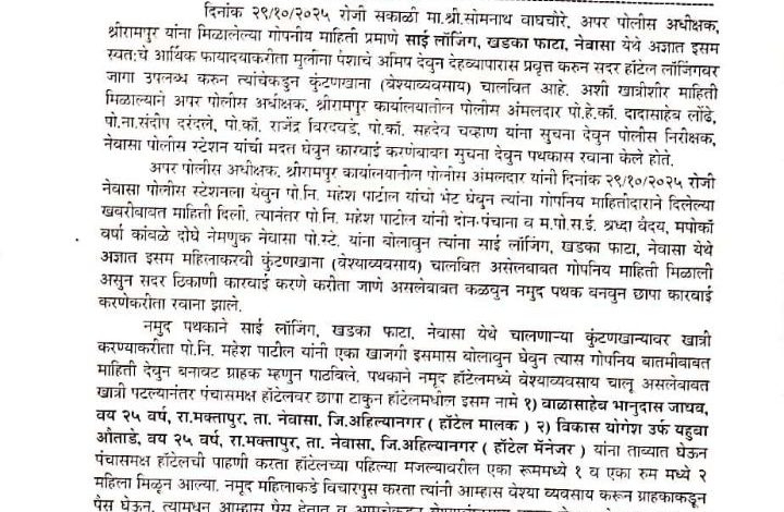 दिनांक २९/१०/२०२५ रोजी सकाळी मा.श्री.सोमनाथ वाघचौरे, अपर पोलीस अधीक्षक, श्रीरामपुर यांना मिळालेल्या गोपनीय माहिती प्रमाणे साई लॉजिंग, खडका फाटा, नेवासा येथे अज्ञात इसम स्वतःचे आर्थिक फायादयाकरीता मुलीना पैशाचे अमिष देवुन देहव्यापारास प्रवृत्त करुन सदर हॉटेल लॉजिंगवर जागा उपलब्ध करुन त्यांचेकडुन कुंटणखाना (बेश्याव्यवसाय) चालवित आहे. अशी खात्रीशीर माहिती मिळाल्याने अपर पोलीस अधीक्षक, श्रीरामपुर कार्यालयातील पोलीस अंमलदार पो.हे.कॉ. दादासाहेब लोंढे, पो.ना.संदीप दरंदले, पो.कॉ. राजेंद्र विरदवडे, पो.कॉ. सहदेव चव्हाण यांना सुचना देवुन पोलीस निरीक्षक, नेवासा पोलीस स्टेशन यांची मदत घेवुन कारवाई करणेबाबत सुचना देवुन पथकास रवाना केले होते.