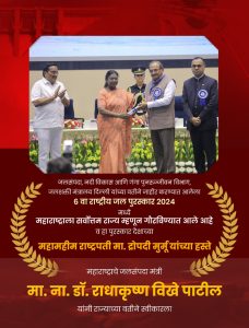 केंद्रीय जलशक्ती मंत्रालयाने राज्याच्या जलसंपदा विभागाला “बेस्ट स्टेट कॅटेगरी २०२४ ” मध्ये प्रथम क्रमाकांच्या मानाच्या पुरस्काराचे वितरण दिल्ली मध्ये राष्ट्रपती द्रौपदी मुर्मू यांच्या हस्ते झाले.राज्याचे जलसंपदा तथा अहील्यानगर जिल्ह्याचे पालक मंत्री डॉ राधाकृष्ण विखे पाटील यांनी पुरस्काराचा स्विकार केला.