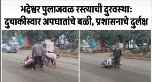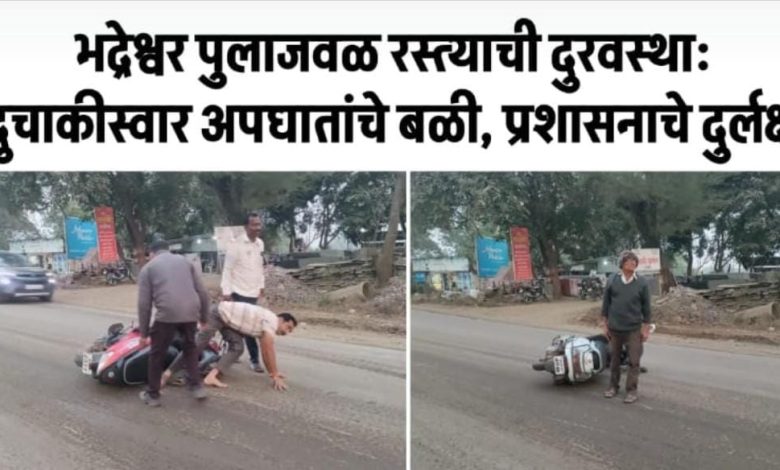 भद्रेश्वर पुलानजीक ड्रेनेजच्या पाण्यामुळे अपघातांची मालिका.