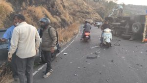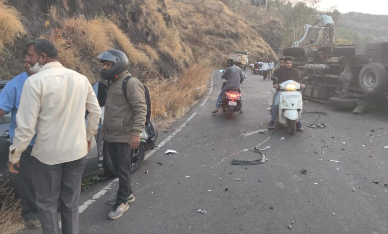 त्याचवेळी समोरून वाईच्या दिशेने येणाऱ्या कंटेनरचा चालक मकसुदन श्रीरामाकांत उपाध्याय (रा. दहिसर, मुंबई) याचा वाहनावरील ताबा सुटला. भरधाव कंटेनरने प्रथम घाटातील संरक्षक कठड्याला जोरदार धडक दिली आणि त्यानंतर आंब्राळे यांच्या कारवर आदळून रस्त्यावर उलटला. अपघातामुळे काही काळ वाहतूक ठप्प झाली होती.