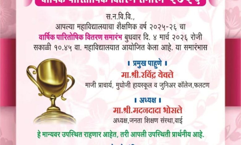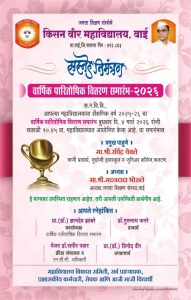 जनता शिक्षण संस्थेच्या किसन वीर महाविद्यालय, वाई यांच्या वतीने शैक्षणिक वर्ष २०२५–२६ चा वार्षिक पारितोषिक वितरण समारंभ बुधवार, दि. ४ मार्च २०२६ रोजी सकाळी १०.४५ वाजता महाविद्यालयात आयोजित करण्यात आला आहे.