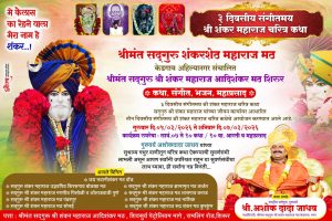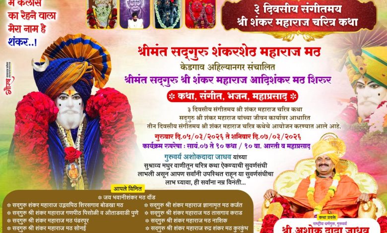 शिरूर नगरीत प्रथमच श्रीमंत सद्गुरु श्री शंकर महाराज यांच्या जीवनकार्यावर आधारित तीन दिवसीय संगीतमय चरित्र कथेचे भव्य आयोजन करण्यात आले आहे.