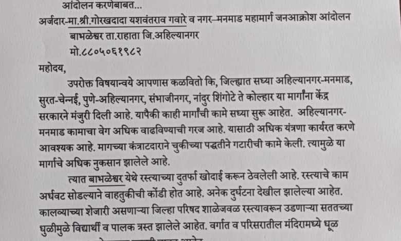 या पार्श्वभूमीवर बाभळेश्वर येथे नगर–मनमाड रस्त्याचे काम तातडीने सुरू करावे, अशी मागणी करण्यात आली असून अन्यथा १६ मार्च रोजी बाभळेश्वर ग्रामस्थ, व्यावसायिक, विद्यार्थी व पालकांच्या वतीने बाभळेश्वर चौकात तीव्र आंदोलन करण्यात येईल, असा इशारा देण्यात आला आहे. या निवेदनाची प्रत लोणी पोलीस स्टेशनचे सहाय्यक पोलीस निरीक्षक यांनाही माहितीस्तव देण्यात आली आहे.