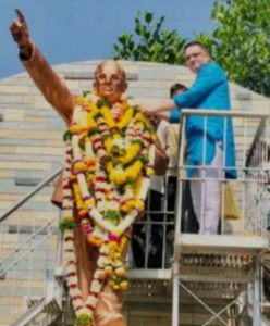 फोटो– डॉ. बाबासाहेब आंबेडकर यांच्या पुतळ्याला अभिवादन करताना श्री रमेश अनिल उबाळे (छाया– निनाद जगताप सायगाव)