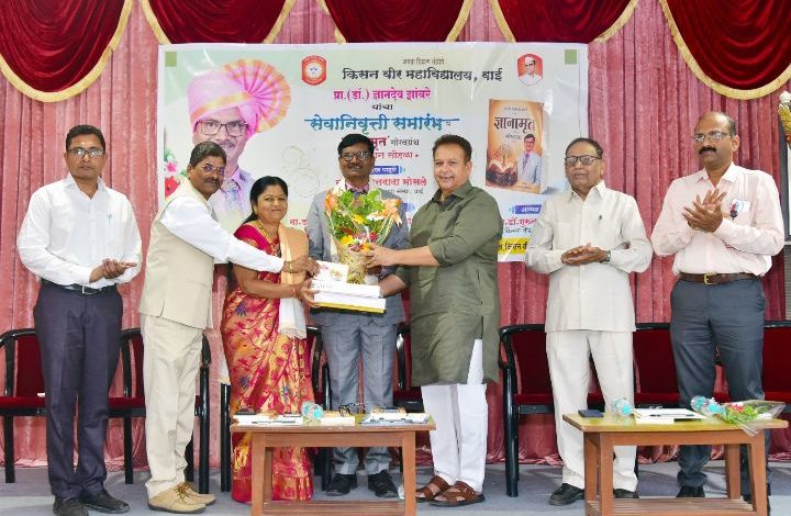 वाई : जनता शिक्षण संस्थेच्या किसन वीर महाविद्यालयातील रसायनशास्त्र विभाग प्रमुख प्रा. (डॉ.) ज्ञानदेव झांबरे यांचा सेवानिवृत्ती कार्यक्रम उत्साहात पार पडला. या कार्यक्रमास प्रमुख पाहुणे म्हणून जनता शिक्षण संस्थेचे अध्यक्ष मा. मदनदादा भोसले हे होते, तर अध्यक्षस्थानी महाविद्यालयाचे प्राचार्य डॉ. गुरुनाथ फगरे होते. कार्यक्रमाच्या सुरुवातीस प्रा. (डॉ.) ज्ञानदेव झांबरे यांच्या जीवनकार्यावर आधारित ‘ज्ञानामृत’ या गौरवग्रंथाचे प्रकाशन मा. मदनदादा भोसले व इतर मान्यवरांच्या शुभहस्ते झाले. डॉ. झांबरे यांचे कार्य समाजापर्यंत पोहोचले पाहिजे, या उद्देशाने ‘ज्ञानामृत हा गौरवग्रंथ महत्त्वाचा आहे. संस्थाध्यक्ष मा. मदनदादा भोसले यांच्या शुभहस्ते प्रा.डॉ.झांबरे यांना मानपत्र देऊन गौरविण्यात आले व झांबरे दांपत्याचा यथोचित सत्कार करण्यात आला. या प्रसंगी संस्थेचे सचिव डॉ. जयवंत चौधरी, खजिनदार प्रा. नारायण चौधरी, संचालक श्री. केशवराव पाडळे, श्री. सुरेश यादव, उपप्राचार्य प्रा.(डॉ.) विनोद वीर, स्टाफ सेक्रेटरी डॉ. शिवाजी ताटे, ज्ञानामृत या ग्रंथाचे संपादक डॉ. संदीप वाटेगांवकर, सहसंपादक प्रा.(डॉ.) चंद्रकांत कांबळे आणि डॉ. संग्राम थोरात यांच्यासह इतर मान्यवर उपस्थित होते.